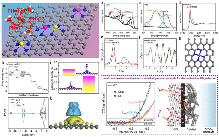 Figure 3.  (a) Atomic Fe-Zn dual-metal sites designed for high-efficiency pH-universal ORR. Reproduced with permission [44]. Copyright 2020, Springer Nature. Chemical characterization of Ce-SA/NHCS: (b, c) High-resolution Ce 3d and N 1s XPS spectra; (d) XANES spectra of Ce-SA/NHCS and CeO2 at the Ce L3-edge; (e) Fourier-transformed EXAFS (FT-EXAFS) spectra of Ce-SA/NHCS and CeO2 at the Ce L3-edge; (f, g) FT-EXAFS fitting curves in k-space and the corresponding atomic structure of Ce-SA/NHCS. Theoretical simulations: (h) Free energy diagrams for the HER and NORR on the Ce-SA/NHCS surface; (i) Calculated adsorption energies for H and NO, along with their corresponding geometries; (j) Projected density of states (PDOS) of the protonated NO molecule and its bonded Ce-N4 site; (k) Charge density differences of the adsorbed NO molecule on the Ce-N4 moiety. Reproduced with permission [12]. Copyright 2023, Elsevier. (l) Schematic illustration of efficient CO2 electrolysis to CO through local coordination manipulation. Reproduced with permission [46]. Copyright 2023, American Chemical Society.