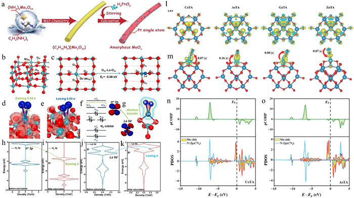 Figure 4  (a) Schematic illustration of the synthesis process for Pt-SA/α-MoOx. Reproduced with permission [48]. Copyright 2020, Elsevier. (b) The optimized structural configuration of MoO3−x. (c) Top view of the MoO3−x structure and the optimized placement of a La atom at a terminal oxygen vacancy site. (d) The electron density difference between N and La/MoO3−x, and (e) MoO3−x, with the red isosurface indicating charge accumulation. (f) Schematic representation of the nitrogen π *2p orbital. (g) Illustration of electron transfer from La to the adsorbed nitrogen molecule. Density of states (DOS) of the N2 2p orbital (h) before and (i) after adsorption on La/MoO3−x. DOS of the La 5d orbital (j) before and (k) following N2 adsorption. Reproduced with permission [51]. Copyright 2022, Elsevier. (l) Charge differential density maps for CoTA, AsTA, GaTA, and ZnTA. (m) Charge differential density maps upon N2 adsorption on MO—CoTA, MO-AsTA, MO-GaTA, and MO-ZnTA. PDOS and COHP of N2 on (n) Mo-CoTA and (o) Mo-AsTA. Reproduced with permission [53]. Copyright 2022, Springer Nature.