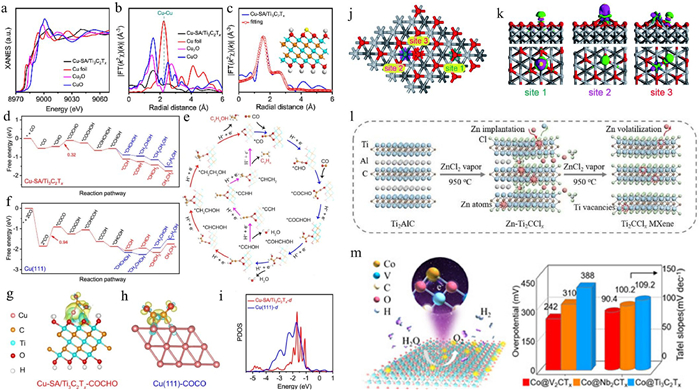 Figure 5.  (a) XANES spectra at the Cu K-edge, with CuO, Cu2O, and Cu foil as reference materials. (b) k2-weighted Fourier transform (FT) EXAFS curves, where χ (k) represents the EXAFS oscillation function. (c) EXAFS fitting curve of Cu-SA/Ti3C2Tx, with an inset illustrating the structural configuration of Cu-SA/Ti3C2Tx. Free energy diagrams of CO reduction on (d) Cu-SA/Ti3C2Tx and (e) Cu (111). (f) Schematic representation of COR pathways. Charge density difference of the *COCHO-adsorbed and *COCO-adsorbed configurations on (g) Cu-SA/Ti3C2Tx and (h) Cu (111), respectively. (i) PDOS of d-orbitals in Cu-SA/Ti3C2Tx and Cu (111), with aligned Fermi levels. Reproduced with permission [59]. Copyright 2021, Springer Nature. First-principles calculations of HER and HzOR: (j) Three distinct active sites on the Rh-SA/Ti3C2Ox catalyst surface: 1 (O), 2 (Rh), and 3 (Rh-O). (k) Side and top views of the three-dimensional charge density difference for H-adsorbed configurations at different sites on the Rh-SA/Ti3C2Ox catalyst surface. Reproduced with permission [61]. Copyright 2021, Royal Society of Chemistry. (l) Schematic representation of the etching process of Ti2AlC to produce vacancy-enriched Ti2CClx MXenes. Reproduced with permission [58]. Copyright 2024, John Wiley and Sons. (m) Mechanism of electrocatalytic enhancement for cobalt single atoms anchored on various MXenes substrates in HER and OER. Reproduced with permission [67]. Copyright 2022, John Wiley & Sons.
