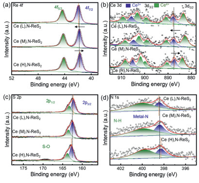 The divided S 2p spectra for Ce (L),N-ReS2 consists of two main characteristic peaks of S 2p1/2 and S 2p3/2 in Fig. 2c, corresponding to the characteristic peaks of Re-S bonding [12]. The positive shift of S 2p1/2 and S 2p3/2 for Ce (M),N-ReS2 may be ascribed to the modulated electron cloud density around S species and the formation of heterostructure interfaces. N 1s spectra are divided into two peaks of metal-N and N—H for Ce, N-ReS2 (Fig. 2d), unveiling the successful N doping substitution of S [33]. The electronegativity of N affects the binding energies in Ce, N-ReS2. The XPS analysis proves that the optimal Ce, N dual doping can modulate electronic interactions at the ReS2 interface and enhance the adsorption and dissociation energies of intermediates, thereby improving the electrocatalytic activity of Ce (M),N-ReS2 [22,32].