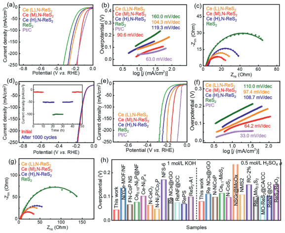 Figure 3.  Electrocatalytic HER activity in 1 mol/L KOH. (a) LSV curves, (b) Tafel slopes and (c) EIS of all catalysts at an overpotential of 44 mV. (d) LSV curves before and after 1000 cycles (inset: Long-life durability of Ce (M),N-ReS2 at different current densities). Electrocatalytic HER activity in 0.5 mol/L H2SO4. (e) LSV curves, (f) Tafel slopes and (g) EIS of all catalysts at an overpotential of 79 mV. (h) Catalytic HER performance compared with other reported transition metal-based catalysts.