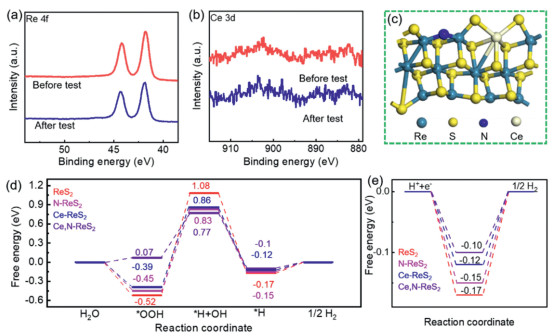 Figure 4.  (a) Re 4f, (b) Ce 3d spectra of Ce (M),N-ReS2 catalyst after stability test. (c) The simulated calculation models. (d) The reaction energy for water dissociation. (e) Gibbs free energy diagrams for HER on different catalyst surfaces.