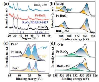 • Figure 1  (a) XRD patterns of c-RuO2, RuO2–350, Pt-RuO2. (b) Ru 3p spectra of RuO2–350 and Pt-RuO2. (c) Pt 4f spectra of Pt-RuO2 and Pt/C. (d) O 1s spectra of RuO2–350 and Pt-RuO2.