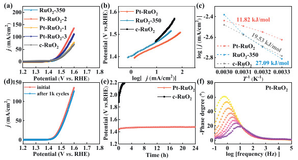 Figure 3.  (a) OER performance, (b) Tafel slope and (c) activation energy of c-RuO2, RuO2–350 and Pt-RuO2. (d) Cyclic stability of Pt-RuO2. (e) Chronopotentiometry test of c-RuO2 and Pt-RuO2. (f) Bode plots of Pt-RuO2 at various potential from 1.40 V to 1.58 V vs. RHE.