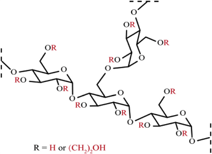 Hydroxyethyl starch 130/0.4 (HES130/0.4) is a derivative of polysaccharide. It is derived from the chemical denaturation of starch molecules, a process that involves the incorporation of hydroxyethyl groups (HE) at the C2, C3, or C6 free hydroxyl positions (Fig. 1), with a compact hyperbranched structure of 14.74 ± 2.01 nm in diameter [11]. Its high molecular weight (130,000 ± 20,000 Da) and amylase resistance (molar substitution = 0.4, C2/C6 = 9) endows HES130/0.4 with prolonged intravascular retention and sustained oncotic pressure maintenance, enabling its clinical use as an intravenous volume expander to treat hypovolemic shock in trauma or hemorrhagic scenarios [12,13]. Moreover, HES130/0.4 is a promising drug delivery platform [1416]. Notably, the osmotic effect of HES130/0.4 depends on the number of particles present in the circulation [17], indicating that efficacy is fundamentally dependent on circulating macromolecular HES130/0.4. Its half-life dictates expansion duration. However, its structural complexity - characterized by high molecular weight and polydispersity - poses significant challenges for direct chemical analysis and quantification.