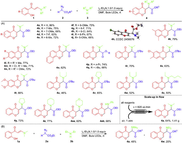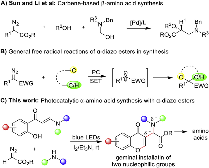 Photocatalytic free radical geminal carboamination of α-diazo esters toward chromone-derived α-amino acids