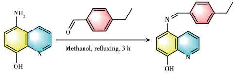 根据已报道的文献[21]中的方法合成了双齿席夫碱配体HL1和HL2。配体HL1和HL2的合成方法相似,以下以配体HL1的合成为例进行叙述。将5-氨基-8-羟基喹啉(20 mmol)和对乙基苯甲醛(20 mmol) 溶于50 mL甲醇中, 在70 ℃油浴锅中加热回流6 h后降至室温,抽滤,并用甲醇洗涤,将粗品在真空下干燥12 h,最终得到黄绿色的席夫碱配体HL1,具体的合成路线如图 2和S1所示。