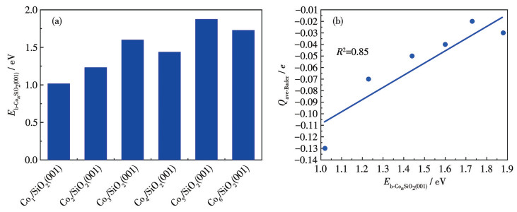 根据公式2计算$E_{\mathrm{b}-\mathrm{Co}_n / \mathrm{SiO}_2(001)} $可得,负载结构的排序(表 1图 4a)为Co5/SiO2(001) > Co6/SiO2(001) > Co3/SiO2(001) > Co4/SiO2(001) > Co2/SiO2(001) > Co1/SiO2(001)。其中Co1/SiO2(001)的结合能最低($ E_{\mathrm{b}-\mathrm{Co}_n / \mathrm{SiO}_2(001)}$=1.02 eV),Co5/SiO2(001)的结合能最高($E_{\mathrm{b}-\mathrm{Co}_n / \mathrm{SiO}_2(001)} $=1.88 eV),说明Co5/SiO2(001)的结构最稳定。