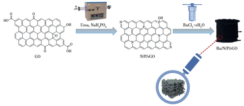 Ru/N/P/rGO的合成方法如图 1所示,首先使用尿素与NaH2PO4对GO同时进行还原和掺杂,实现了优化电子结构、提高本征活性的目的。为了创造更多的活性位点,增强传质性能,又使用硝酸进一步进行氧化预处理,并与维生素C、RuCl3·xH2O一起在水热釜中通过水热还原法形成石墨烯气凝胶,同时负载钌纳米颗粒,进而制备得到Ru/N/P/rGO。为了便于评价掺杂效果,在相同条件下制备了Ru/rGO。