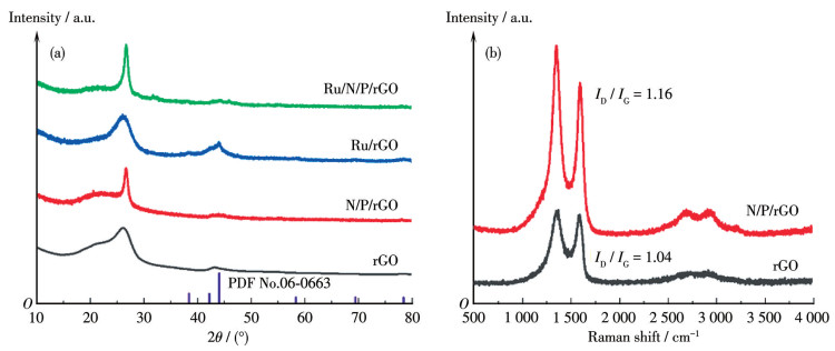 为了进一步分析材料的物相结构及掺杂效果,对其进行了XRD分析。如图 3a所示,对于rGO来说,可以看出其在26.4°和42.5°附近出现了显著的衍射峰,对应典型石墨碳的(002)和(100)晶面,此外,在低角度处出现一个肩峰,这是由较薄的rGO层相互堆叠引起的。Ru/rGO在38.37°、42.17°、44.03°处出现了新的衍射峰,分别对应金属钌的(100)、(002)和(101)晶面(PDF No.06-0663)完全一致。N/P/rGO与未掺杂之前的rGO的衍射峰几乎是一致的,但低角度的衍射峰略微向右偏移,这可能是N掺杂引起的。Ru/N/P/rGO在38.37°、42.17°、44.03°处也出现了微弱的衍射峰,这是由于Ru负载量较低。通过ICP-OES可知Ru/N/P/rGO中金属Ru的质量分数仅为2.18%,Ru/rGO中金属Ru的质量分数也仅为1.98%。一般来说,碳材料在经过杂原子掺杂之后的缺陷程度会有一定的变化,缺陷的存在能够创造出更丰富的活性位点,有利于提升材料的整体催化性能。拉曼光谱可以用来测定掺杂前后的缺陷变化,其中D峰代表碳的缺陷和无序晶格,G峰属于面内振动模式,与碳原子的石墨化程度有关。如图 3b所示,rGO的D峰(1 350 cm-1)与G峰(1 590 cm-1)强度比(ID/IG)为1.04,N/P/rGO的ID/IG为1.16,说明掺杂之后材料的缺陷程度有一定的增加,这对于创造更多的活性位点是有益的。