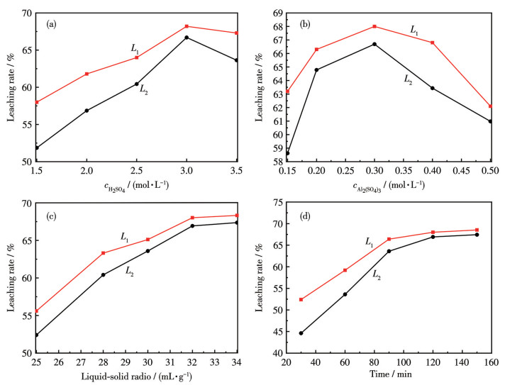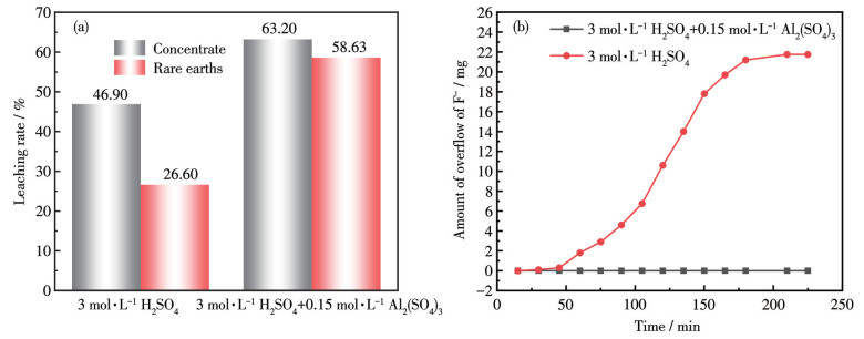 • In this study, aluminum sulfate was used to enhance the leaching of bastnasite in mixed rare earth concentrate (MREC) by sulfuric acid, then triethyloctamine and N1923 were used to extract residual acid and rare earth elements in the leaching solution, sequentially to produce calcium sulfate and cryolite by-products and monazite concentrate. The results show that the strong coordination of Al with F not only strengthens the leaching but also eliminates the generation of HF, which is convenient for the separation and comprehensive recycling of rare earth (RE), F, and Al, and eliminates the environmental impact. For the 100 mesh MREC, the concentrate and RE leaching rates by a mix solution of 3.0 mol·L-1 H2SO4 and 0.3 mol·L-1 Al2(SO4)3 with a liquid-solid ratio (the ratio of the volume of liquid to the mass of solid in mineral fluid) of 32 mL·g-1 and a reaction of 135 ℃ and 200 r·min-1 for 2 h reached 68.00% and 66.91%, respectively. The leaching rate of F- and the decomposition rate of CaF2 are 94.42% and 99.3%, respectively. After triethyloctanamine extracted most of the residual acid in the leaching solution, the RE was directly extracted with N1923, and the extraction rate was 97.38%. The RE in the organic phase was stripped by HCl with a stripping rate of 98.05%, and the ratio of Al to RE in the stripping solution was only 0.008 0. The F-Al complex in raffinate was transferred to cryolite by adding an external fluorine source to realize the recovery of F-Al resources.