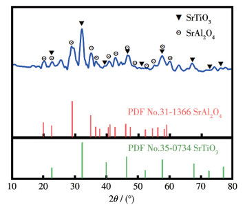 图 3为SP3的XRD图。该图在2θ为32.5°、40.1°、46.6°、58.6°、68.0°和77.4°等处都出现较为尖锐的强衍射峰。通过MDI软件和标准PDF卡片分析可知,这些衍射峰均归属于SrTiO3。另外,样品中还检测到了SrAl2O4的特征峰,分别位于33.4°、40.5°、47.1°、58.7°和68.1°。结合EDS和XRD分析可知,Sr、Ti元素以SrTiO3晶相形式存在。这表明样品中含有SrTiO3和SrAl2O4两种物质,这与EDS元素分析中的推测一致。