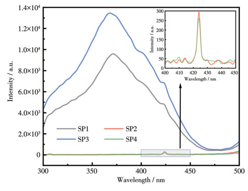 图 4为不同TiO2添加量下制备的SrTiO3∶Eu3+/SrAl2O4∶Eu2+,Dy3+的激发光谱。由图可知,高添加量的样品SP1、SP3在350~450 nm范围内表现出宽谱激发特征,其包含2个特征激发峰,分别位于374和415 nm,而低添加量的样品SP2、SP4仅在415 nm处出现单一激发峰。其中,374 nm处的激发峰为SrAl2O4∶Eu2+的特征峰,415 nm处的激发峰为SrTiO3∶Eu3+的特征峰[20-21]。另外,高添加量样品SP1、SP3的激发光强度远大于低添加量样品SP2、SP4的激发光强度,这一现象表明TiO2添加量的增加可增强材料的激发光强度并激发光谱范围。