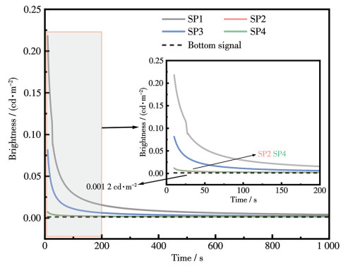 图 6为不同TiO2添加量下制备的SrTiO3∶Eu3+/SrAl2O4∶Eu2+,Dy3+的余辉曲线。由图可知,样品的余辉衰减主要经历了快衰减(0~100 s)和慢衰减(100~ 1 000 s)两个过程,在停止光照时的起始亮度较高,之后的100 s内,余辉亮度衰减迅速,在500 s左右时,亮度衰减达到平稳。另外,高添加量样品SP1、SP3的初始亮度远高于低添加量样品SP2、SP4,分别可达到0.217和0.080 cd·m-2,且余辉时间也可达到1 000 s以上,而低添加量样品SP2、SP4的初始亮度较低,仅约为0.010 cd·m-2。由此可知TiO2的添加量为1 mol时制备的材料的整体亮度高于TiO2添加量为0.1 mol时的亮度,表明合理控制TiO2的添加量,可以提升材料整体的余辉亮度,明显改变其发光性能。