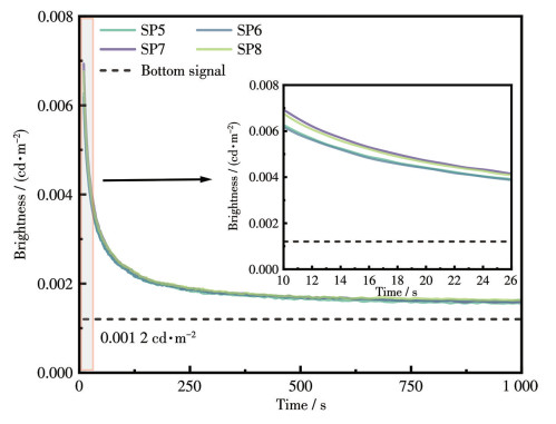 图 9为不同Eu2O3添加量下制备的SrTiO3∶Eu3+/SrAl2O4∶Eu2+,Dy3+的余辉曲线。由图可知,该组样品的余辉曲线均高度重合,其中SP6的初始余辉亮度达到最大值0.006 cd·m-2,并且所有样品的余辉时间均超过1 000 s。由此可见,SrTiO3∶Eu3+/SrAl2O4∶Eu2+,Dy3+的余辉亮度和余辉时间并不随Eu2O3添加量的增加而产生明显变化。原因可能是SrTiO3∶Eu3+/SrAl2O4∶Eu2+,Dy3+具有丰富的电子能级,受光照激发时,晶格发生振动,Eu2+同步产生能级跃迁;借助晶格弛豫作用,部分Eu2+将能量传递并存储于特征缺陷能级。撤去光照后,缺陷能级中被俘获的电子缓慢释放,驱动材料呈现长余辉特性[26]。基于此推断,当Eu2O3的添加量达到0.010 0 mol时,SP5经过激发光照射后,其晶格缺陷能级所捕获的电子数达到饱和,不再随着Eu2O3添加量的增加而显著变化。