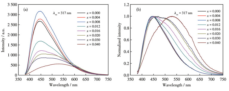 我们对合成的一系列荧光粉进行了光致发光测试。图 2a为不同掺杂浓度的荧光粉在317 nm的激发波长下的室温发射光谱图,所有的谱图在400~650 nm范围内呈宽峰发射,这归因于Eu2+的4f 65d-4f7的允许跃迁。随着x的增加,光谱发射峰的发光强度先增加,在0.008时达到最大值,随后下降,主峰也发生了红移。为了进一步探索发射光谱移动的规律,我们将发射光谱强度进行了归一化处理,结果如图 2b所示。当Ca2+浓度为0时,发射峰为一个不对称的宽峰发射,主峰在450 nm,为低温相Ba3P4O13∶Eu2+荧光粉引起的特征发射。这种不对称的发射峰源于Ba3P4O13基质中的Ba具有2个不同配位环境的晶格位点。2种晶格位点的晶体场配位环境相似,导致了Eu2+占据2个位点以后的发射光谱重叠。但是,随着x的增加,光谱的范围变宽,高温相的Ba3P4O13∶Eu2+荧光粉的特征峰出现,且随着x的增加,强度越来越高;当x=0.030时,荧光粉的发射光谱变化为2个区分明显、强度相当的发射峰,主峰分别在450和500 nm左右,这说明此时的产物中,高温相的发射和低温相的发射同时存在。当x增加到0.040时,由低温相引发的位于450 nm的蓝光发射峰基本消失。这表明,大部分低温相已经转化为高温相。与此同时,高温相引起的发射峰变得极为明显,其主峰位于530 nm,呈现出对称的宽带发射特征。这一结果与Li等[10]报道的high-Ba3P4O13∶Eu2+荧光粉的发射峰略微差别。推测出现这种差异的原因可能是,在当前条件下低温相并没有完全转化为高温相,产物的发射光谱中还有少量低温相的发射峰,进而致使主峰发生了轻微蓝移,这也可以从XRD物相分析结果中得到印证。