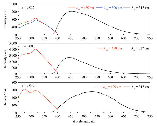 图 3为Ba2.991-3xP4O13∶0.009Eu2+,3xCa2+(x=0.000、0.016、0.040)荧光粉的激发和发射光谱图,其中Ba2.991P4O13∶0.009Eu2+荧光粉的激发峰为250~400 nm近紫外区域的宽带激发,主峰为317 nm。这种大范围的宽带激发与Ba3P4O13基质复杂的晶体场环境和Eu2+占据不同的位点有关[11],同时发射光谱为不对称的蓝光发射峰。然而,相较于x=0.000时,Ba2.871P4O13∶0.009Eu2+,0.120Ca2+荧光粉的激发光谱发生了很大的变化。原本位于317 nm处的强激发峰减弱,同时主峰移动至270 nm的短波长处。这种激发峰的移动现象,是由于Ca2+的引入促使高温相生成,进而导致晶体结构中多面体的变形性增强、结构无序性加剧,最终对Eu2+的跃迁造成了影响。而Ba2.943P4O13∶0.009Eu2+,0.048Ca2+荧光粉在317 nm处的激发峰强度下降,激发和发射光谱同时具有低温相和高温相的激发光谱特性,这表明此时的荧光粉正处于晶相转变的中间阶段。