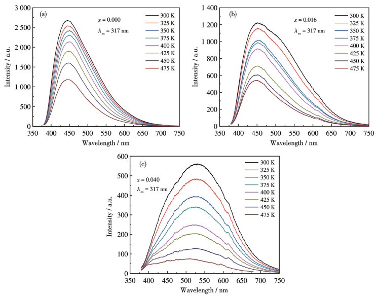 荧光粉的热稳定性对荧光粉在白光LED中的应用至关重要。这是因为荧光粉要涂敷在LED芯片上,LED芯片产生的热量不仅会对芯片本身产生影响,也会对荧光粉的发光性质产生影响[14]。因此,我们在300~475 K的范围内测试了Ba2.991-3xP4O13∶0.009Eu2+,3xCa2+(x=0.000、0.016、0.040)荧光粉在不同温度下的发射光谱。图 4a为Ba2.991P4O13∶0.009Eu2+荧光粉在不同温度下的发射光谱,从图中可以发现,发射峰的强度随着温度的增加呈现持续递减的变化趋势,这种现象是荧光粉的热猝灭效应(TQ)引起。图 4b和4c为Ba2.991-3xP4O13∶0.009Eu2+,3xCa2+(x=0.040、0.016)荧光粉在不同温度下的发射光谱。从图中可以看出,这些发射光谱均呈现出相同的递减趋势。
