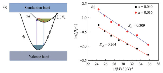 据报道,荧光粉的TQ主要源于温度相关的电子与声子之间的相互作用。荧光粉的温度猝灭可用2种公认的机理来解释:Dorenbos自电离模型和热激活交叉效应[15]。在自电离模型理论中,电子通过热激活到达基质的导带,进而转变为离域化自由移动的电子。随后,这些电子可通过导带上的电子-空穴复合[16]等方式进行非辐射跃迁,最后致使发光强度降低。不过,该理论仅适用于稀土离子的5d能级的位置相较于5d-4f交叉点更接近荧光粉基质导带最小值的情况,因而存在一定的局限性。我们合成的荧光粉的温度猝灭可用热激活交叉效应进行解释。如图 5a所示,电子吸收能量从4f基态跃迁到5d激发态,激发的电子通过辐射跃迁返回到基态,产生发射。但是当温度到达一定值时,强烈的振动使得电子被进一步激发到4f-5d能级交叉点,并通过非辐射的方式释放到基态,使得部分能量损失,这就是制备的荧光粉发光强度随温度上升又下降的原因。TQ发生的概率强烈地依赖于猝灭势垒,即活化能(Ea)。电子在被加热以克服Ea势垒时需要吸收能量,Ea越大,越难跨越势垒,荧光粉越稳定。Ea可以通过下面的Arrhenius公式进行计算。