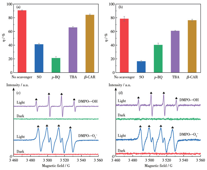 Figure 10 Results of free radical capture experiments by CN/BBOBI under (a) visible light and (b) NIR light irradiation; EPR spectra of DMPO-·O2- and DMPO-·OH produced by CN/BBOBI under (c) visible light and (d) NIR light irradiation