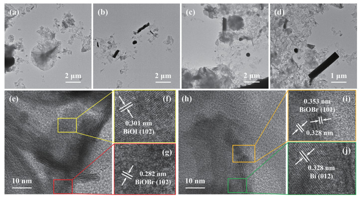 图 4a~4d为CN/BBOBI的TEM图。图中,棒状、花状与不规则纳米片状形貌共存,与SEM图结果一致。图 4e和4h为CN/BBOBI的高分辨TEM(HRTEM)图,图 4f、4g、4i和4j为对应区域的局部放大图。图中晶格间距为0.328、0.282、0.353和0.301 nm的晶格条纹分别与Bi的(012)晶面、BiOBr的(102)和(101)晶面、BiOI的(102)晶面相匹配,进一步表明CN/BBOBI中存在Bi、BiOBr和BiOI。NVCN为无定型态,因此,HRTEM图中无法探测到其晶格条纹[37-38]。从HRTEM图中可以观察到,Bi、BiOBr及BiOI三者的晶格条纹间并不存在明显的界限,证实了界面异质结的形成。此外,BiOBr和BiOI的条纹附近可以观察到明显的无序区域,表明样品中存在缺陷。