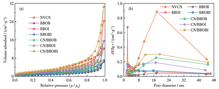 图 5a为所制备样品的N2吸附-脱附等温线。由图可知,各样品均具有Ⅳ型等温线和典型的H3型回滞环,符合介孔材料的特征[39],表明所制备样品具有介孔结构。光催化材料表面活性位点的数量在很大程度上取决于比表面积的大小。使用Brunauer-Emmett-Teller(BET)法计算所制备样品的比表面积,结果见表 1。NVCN的BET比表面积最大,为72 m2·g-1。CN/BBOB、CN/BBOI和CN/BBOBI的BET比表面积分别为37、42和45 m2·g-1,明显大于BBOB (11 m2·g-1)、BBOI(24 m2·g-1)和BBOBI(27 m2·g-1)。各样品的孔径分布曲线如图 5b所示,表 1列出了相应的孔结构参数。所有样品中,CN/BBOBI的平均孔径最大,约为19.50 nm,其孔容(0.29 cm3·g-1)介于NVCN(0.41 cm3·g-1)和BBOBI(0.21 cm3·g-1)之间。较大的比表面积、孔径和孔容可以为光催化反应提供更多的活性位点[40]。