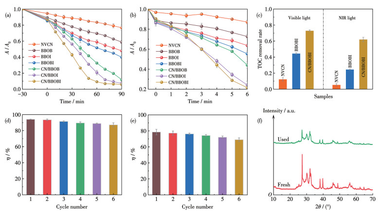 Figure 8 Degradation curves of CIP by the prepared samples under (a) visible light and (b) NIR light irradiation, and (c) the corresponding TOC removal rates; Results of cyclic experiments on the degradation of CIP by CN/BBOBI under (d) visible light and (e) NIR light irradiation; (f) XRD patterns of CN/BBOBI before and after cycling