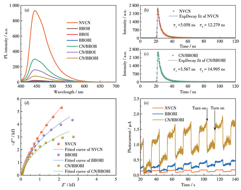 图 9 (a) 所制备样品的PL谱图; (b) NVCN和(c) CN/BBOBI的TRPL谱图; NVCN、BBOBI和CN/BBOBI在可见光照射下的(d) EIS和(e) 瞬态光电流响应曲线