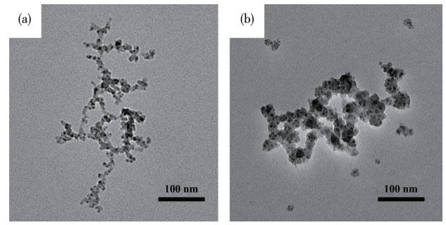 Fig. 1 displays the TEM images of AgCl@SiO2-NH2 and AgCl@SiO2/CTS. It can be seen that sample AgCl@SiO2-NH2 exhibited a chain-like structure of non-spherical particles with a size of about 12 nm (Fig. 1a). Besides, there existed a thin SiO2 modified layer on the surface of AgCl NPs, which form chain-like aggregates likely owing to interactions (e.g., van der Waals forces, potential hydrogen bonding involving —NH2 or surrounding solvent molecules) between the functionalized NPs. After grafting CTS onto AgCl@SiO2-NH2, the as-obtained sample AgCl@SiO2/CTS still retained the core-shell structure, but its size (about 30 nm) rose significantly as compared with that of AgCl@SiO2-NH2. Moreover, AgCl@SiO2/CTS displayed a slight sign of aggregation, and each AgCl@SiO2/CTS NPs contained several AgCl cores (Fig. 1b).