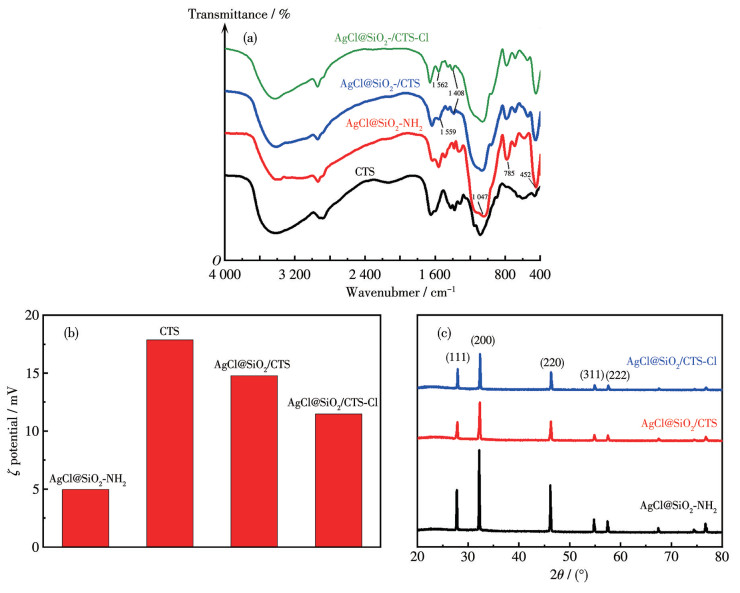 FTIR spectra were recorded to confirm the presence of the surface-modified layer on various as-prepared samples. As shown in Fig. 2a, AgCl@SiO2-NH2, AgCl@SiO2/CTS, and AgCl@SiO2/CTS-Cl show the characteristic Si—O bending vibration peak at 452 cm-1 and the Si—O—Si stretching vibration peaks at 785 and 1 047 cm-1, which proves that there is indeed a modified layer on their surfaces[37]. AgCl@SiO2/CTS showed the Schiff base adduct peak at 1 408 cm-1, which is analogous to the deformation of the aldehyde′s C—H bond[38-39]. Crucially, there are new characteristic bands in the AgCl@SiO2/CTS spectrum: the amide Ⅰ band (C=O stretching) at approximately 1 650 cm-1 and the amide Ⅱ band (N—H bending) at 1 559 cm-1, which are distinctive fingerprints of the amide groups in the CTS molecular chain. These FTIR data confirm that CTS molecules are successfully grafted onto the surface of AgCl@SiO2-NH2. After the chlorination of AgCl@SiO2/CTS, the intensity of the amide Ⅱ bond (1 559 cm-1, N—H bending vibration) decreased and slightly shifted to 1 562 cm-1, which is obviously due to the partial substitution of the N—H bond by the N—Cl bond[40], which confirmed the successful synthesis of AgCl@SiO2/CTS-Cl. ζ potential measurements were used to elucidate the surface modification process of AgCl@SiO2, including amino functionalization, CTS grafting, and subsequent chlorination. As shown in Fig. 2b, AgCl@SiO2-NH2 was obtained by modification of an amino group at AgCl@SiO2, which exhibited a ζ potential of 4.98 mV, indicating the introduction of surface amino groups. The ζ potential of AgCl@SiO2/CTS was 14.80 mV, which was between the ζ potential of pure CTS (17.5 mV) and that of AgCl@ SiO2-NH2 (4.98 mV), indicating the successful grafting of CTS. The chlorinated sample AgCl@SiO2/CTS-Cl showed a ζ potential of 11.5 mV, which reflects successful chlorination. Notably, the changes in ζ potential of these samples (AgCl@SiO2-NH2, CTS, AgCl@SiO2/CTS, and AgCl@SiO2/CTS-Cl) correspond to the introduction of different functional groups at each modification step, thus confirming the continuous surface modification. Fig. 2c shows the XRD patterns of AgCl@SiO2-NH2, AgCl@SiO2/CTS, and AgCl@SiO2/CTS-Cl. All three samples displayed multiple characteristic peaks of face-centered cubic phase AgCl (PDF No.31-1238) at 2θ values of 27.9° (111), 32.5° (200), 46.53° (220), 55° (311), and 57.6° (222), which refers to the formation of well-crystallized AgCl[41-42]. Besides, a very broad and weak hump in the 2θ range of 20°-28° corresponds to an amino-functionalized amorphous silica layer.