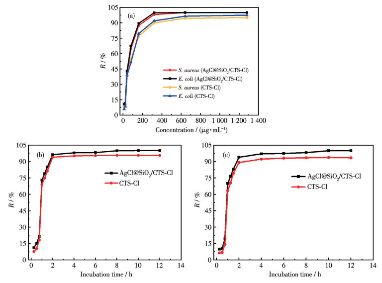 Incubation time / h Bacterial reduction rate / % E. coli S. aureus AgCl@SiO2-NH2 AgCl@SiO2/CTS AgCl@SiO2/CTS-Cl AgCl@SiO2-NH2 AgCl@SiO2/CTS AgCl@SiO2/CTS-Cl 0.5 0.2 1.9 15.2 0 1.1 10.4 1 0.2 2.8 73.0 0.1 1.8 75.0 1.5 1.7 3.7 85.0 0.7 2.4 83.0 2 2.3 4.8 96.3 1.5 4.0 94.0 4 6.3 7.4 98.0 3.0 6.5 97.1 6 9.8 11.8 98.2 4.4 11.1 97.4 8 11.8 14.5 99.8 9.9 13.9 99.5 10 14.2 15.2 100.0 11.7 15.8 99.9 12 17.9 20.9 100.0 14.4 19.7 100.0 Conditions: the concentration of both E. coli and S. aureus was 107 CFU·mL-1; the chlorinated AgCl@SiO2/CTS-Cl contained 3.74% of active chlorine; the concentration of the three materials was 640.00 μg·mL-1. 3. Conclusions