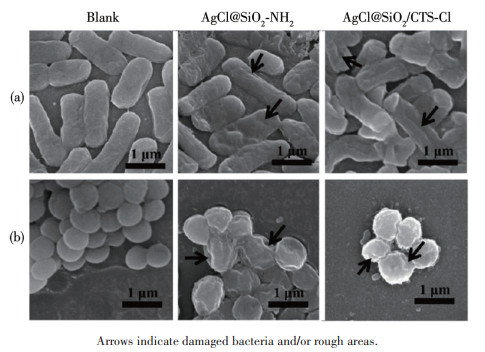 The antibacterial mechanism of AgCl@SiO2/CTS-Cl was further investigated by observing the change in germ morphology with SEM. Fig. 4 shows the SEM images of the normal bacteria and those treated with 50 mg·mL-1 of AgCl@SiO2-NH2 or 50 mg·mL-1 of AgCl@ SiO2/CTS-Cl for 12 h. Original E. coli and S. aureus had a short rod morphology and a uniform spherical shape, respectively, and after being treated with AgCl@SiO2-NH2 and AgCl@SiO2/CTS-Cl, the morphology of their cells significantly changed along with the appearance of cell debris. Besides, the shrunk and deformed membrane and the rough areas indicated by arrows demonstrate that the antibacterial effect ascribed to active Ag+ and Cl- is closely related to the damage of the bacterial membranes. Moreover, AgCl@SiO2/CTS-Cl exhibited much better antibacterial performance than AgCl@SiO2-NH2, proving that synergistic antibacterial effects exist between Ag+ and active Cl-.
