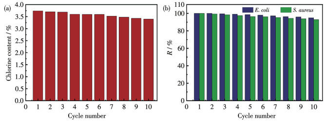 The potential recycling of antibacterial activity is an important feature of chloramine, whose antibacterial activity can be recovered by simple chlorination. Fig. 5a gives the chlorine content of the as-recovered AgCl@SiO2/CTS-Cl during 10 cycles of chlorination. The active chlorine content of the AgCl@SiO2/CTS-Cl remained high at approximately 3.48% (retaining 93% of the initial chlorine content) even after 10 cycles of antibacterial testing and regeneration (Fig. 5a), which indicates that it has an excellent regenerability. Fig. 5b shows the bacterial reduction rate of the regenerated AgCl@SiO2/CTS-Cl. The antibacterial capability of the regenerated AgCl@SiO2/CTS-Cl was proportional to its Cl content and remained stable even after 10 cycles of antimicrobial tests. In particular, the bacterial reduction rate after 10 cycles of antibacterial treatment for both stains remained as high as 98%.