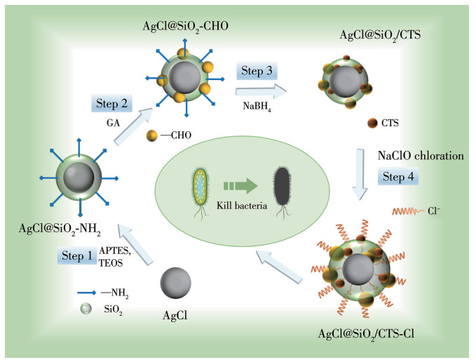 Herein, we establish a facile one-pot route (Scheme 1) to prepare amino-silica functionalized silver chloride (AgCl@SiO2-NH2) nanoparticles (NPs). Then we graft glutaraldehyde, the linker molecule, onto the surface of AgCl@SiO2-NH2 to afford AgCl@SiO2-CHO. Further, we conjugate CTS, the chloramine precursor possessing an amide bond, onto the surface of AgCl@SiO2-CHO to yield AgCl@SiO2/CTS. Finally, we chlorinate AgCl@SiO2/CTS with sodium hypochlorite to obtain AgCl/CTS-based N-chloramine (AgCl@SiO2/CTS-Cl). This article deals with the preparation and characterization of AgCl@SiO2/CTS-Cl as well as the evaluation of its antibacterial performance towards Escherichia coli (E. coli) and Staphylococcus aureus (S. aureus) bacteria as the model pathogens.