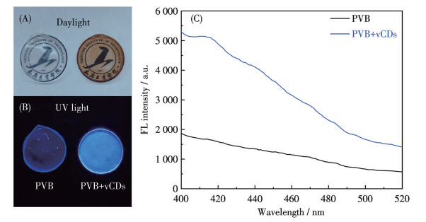 • This study developed a facile and green method using vinegar as the carbon source to prepare fluorescent carbon quantum dots (vCDs) via direct dialysis. The synthesized vCDs were characterized by morphology, composition, and fluorescent properties. The results showed that the vCDs had a mass concentration of 0.006 2 g·mL-1. The vCDs showed the uniform particle distribution with an average size of 4.05 nm and displayed optimal fluorescence emission at 460 nm. Notably, the vCDs showed excellent photostability and salt resistance. Furthermore, the fluorescence of vCDs was highly sensitive to pH due to the surface protonation effects and Fe3+ via selective fluorescence quenching, which endowed the potential capacity in pH and Fe3+ sensing. Besides, vCDs were incorporated into polyvinyl butyral (PVB) to fabricate the fluorescent films.