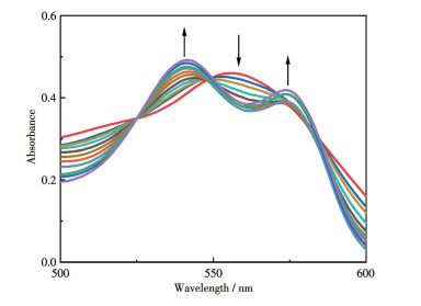 为了定性分析锰羰基配合物的CO释放性能,选取配合物3为代表,通过肌红蛋白法研究了其在红光作用下的分解情况。避光条件下,在连二亚硫酸钠还原剂存在时,脱氧肌红蛋白溶液的Q带保持稳定,证实配合物3具有优异的暗稳定性(图S6)。当该溶液用LED红光照射时,其脱氧肌红蛋白在560 nm处的吸收峰快速下降并在540和577 nm处产生2个马鞍形吸收峰,即为碳氧肌红蛋白特征峰(图 8)。该结果表明光激发促使锰配合物分解释放CO,释放的CO随即与脱氧肌红蛋白(deoxy-Mb)结合生成碳氧肌红蛋白(Mb-CO),直接证实了该配合物具备光诱导释放CO能力。