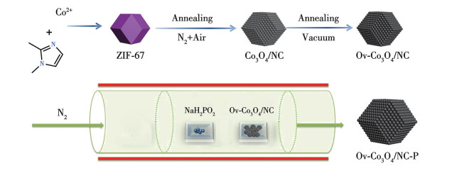 通过气相沉积法引入磷原子。将一定量(30、50、100 mg)的次磷酸钠和500 mg的Ov-Co3O4/NC分别放置在瓷舟的下游和上游,然后在N2保护下进行煅烧,以5 ℃·min的升温速率加热至300 ℃并保温120 min,待冷却至室温后取出瓷舟,根据次磷酸钠的加入量(30、50、100 mg)分别将产物命名为Ov-Co3O4/NC-P-30、Ov-Co3O4/NC-P-50、Ov-Co3O4/NC-P-100。制备流程如图 1所示。