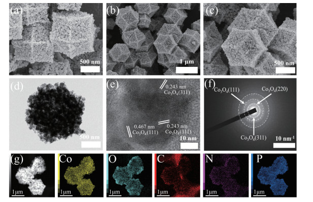 Figure 2.  SEM images of (a) Ov-Co3O4/NC and (b, c) Ov-Co3O4/NC-P-50; (d) TEM image, (e) HRTEM image, (f) SAED diagram, and (g) EDS elemental mappings of Ov-Co3O4/NC-P-50