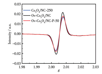 进一步探索了磷掺杂对氧空位浓度的影响。由于氧化物中的氧原子离开晶格时会带走2个属于其它原子的电子,因此可以用未配对电子来表征氧空位浓度,EPR光谱可以用于检测所制备材料中的未配对电子。如图 4所示,g=2.003 4时对应的峰强度可以认为是材料中氧空位的浓度[27-28]。与Ov-Co3O4/NC相比,Ov-Co3O4/NC-P-50的EPR信号显著更弱,这表明材料中氧空位的浓度更小,甚至接近原始Co3O4/NC-250。EPR信号的显著下降表明P的填充导致了氧空位浓度的降低,这与XPS的结果一致。