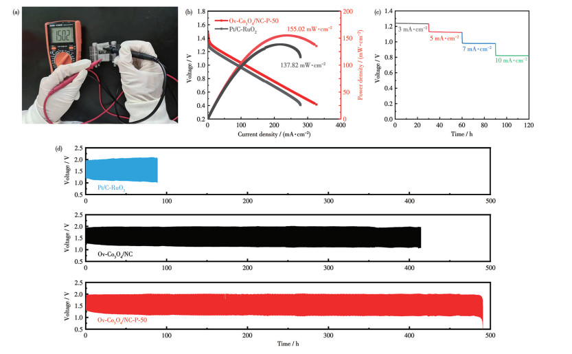 Figure 7  (a) Open-circuit potential of Ov-Co3O4/NC-P-50 zinc-air battery; (b) Discharge curves of Co3O4/NC and Pt/C-RuO2 zinc-air batteries and corresponding power density curves; (c) Voltage changes of Ov-CO3O4/NC-P-50 zinc-air battery at 3, 5, 7, and 10 mA·cm-2; (d) Charge-discharge cycle curves of Ov-Co3O4/NC, Ov-Co3O4/NC-P-50, and Pt/C-RuO2 zinc-air batteries at 2 mA·cm-2