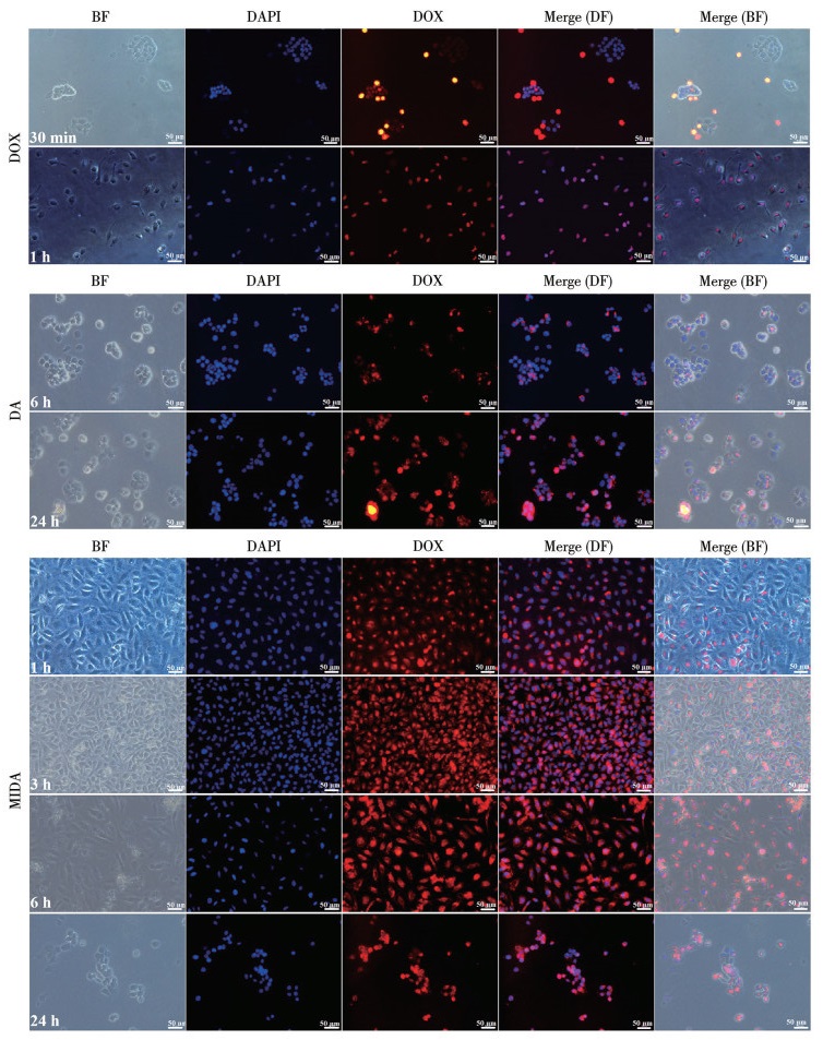 Figure 11  Cellular uptake and distribution images of MIDA, DA and DOX in MCF-7 cells