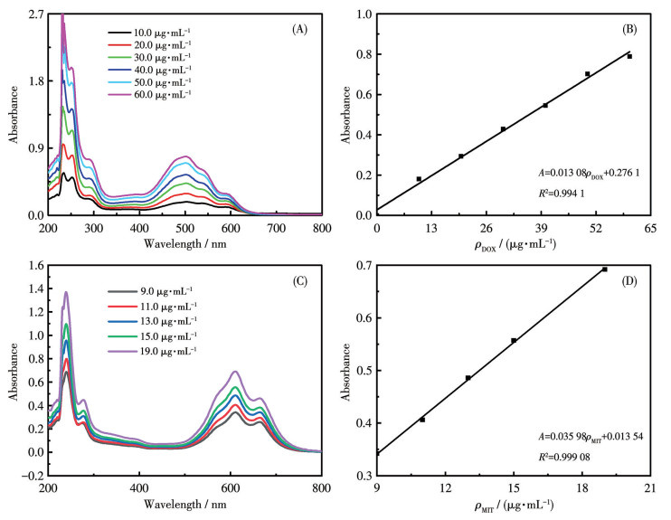 图 3  不同质量浓度的DOX在NaAc介质中的(A) UV-Vis吸收光谱和(B) 标准曲线; 不同质量浓度的MIT在NaAc介质中的(C) UV-Vis吸收光谱和(D) 标准曲线