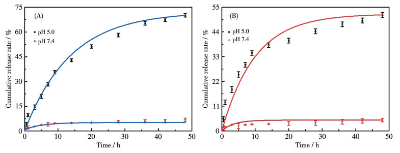 Figure 6.  In vitro drug release simulation test of (A) MIT and (B) DOX in MIDA