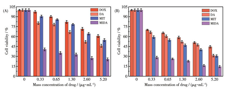 Figure 7  Effect of MIDA, DA, MIT, and DOX on MCF-7 cytotoxicity for (A) 24 h and (B) 48 h measured by CCK-8 assay