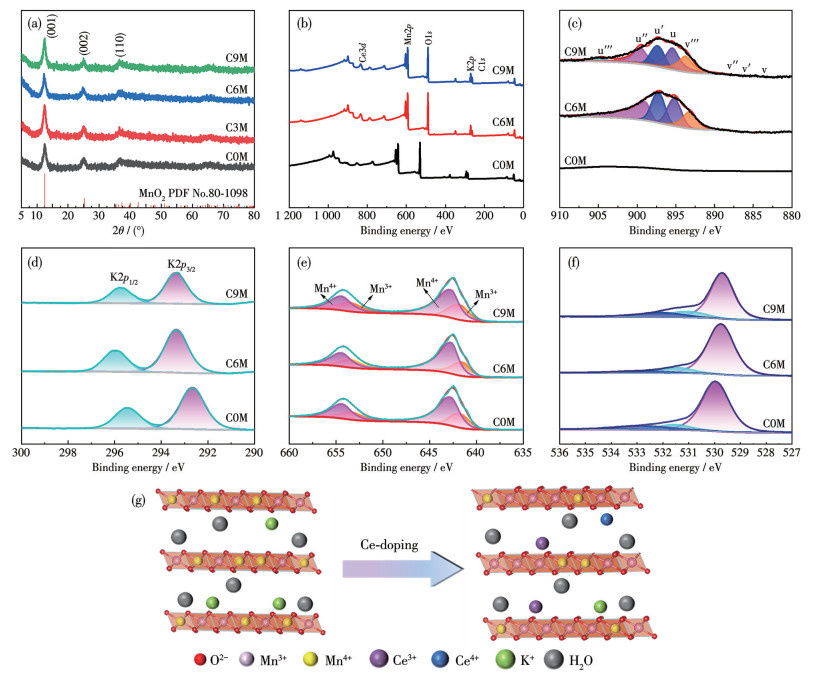 图 1 (a) 所有样品的XRD图; C0M、C6M、C9M的(b) XPS全谱图及(c) Ce3d、(d) K2p、(e) Mn2p和(f) O1s XPS谱图; (g) Ce离子掺杂前后δ-MnO2的晶格结构示意图
