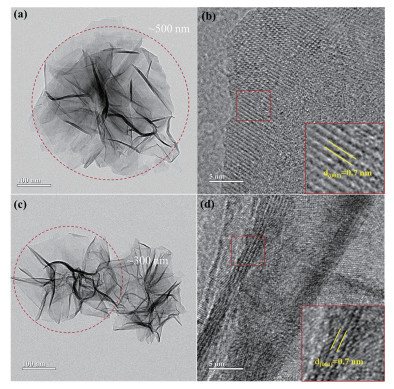 图 2为不同样品的SEM照片。可以看出C0M为由纳米片组装而成的纳米花球,花球的直径约为2 μm。随着Ce离子掺杂浓度的增加,花球结构逐渐模糊,且颗粒尺寸减小。这是因为前驱液中引入Ce离子后,MnO2晶体成核的位点增多,在前驱液浓度等条件不变的情况下晶体生长尺寸减小。根据能谱(EDS)面扫图及相应谱图(图 3)可知,C6M中含有Mn、O、K和Ce元素,Ce元素的均匀分布进一步证明其成功掺入MnO2的晶格中。TEM照片进一步揭示了C0M和C6M的微观形貌。由图 4a和4c可以看出,C0M和C6M均由纳米片组装而成,纳米片透明且有褶皱,C6M的颗粒直径约为300 nm。高倍透射电镜(HRTEM)照片(图 4b、4d)显示C0M和C6M的(001)晶面间距一致,约为0.7 nm。这说明Ce离子掺杂没有引起明显的晶格尺寸变化,也间接说明Ce离子没有置换与其半径相差很大的Mn4+或Mn3+离子。图 5为所有样品的氮气吸附-脱附等温线,根据国际纯粹与应用化学联合会(IUPAC)规则,所有曲线均为Ⅳ型等温线,且为H4型滞后环,这说明样品中存在介孔结构,介孔的存在可以促进电解质离子的快速转移和电子的高效传输。由图 5插图可知,C0M和C3M的孔径主要分布在8~15 nm,C6M和C9M的孔径增大至15~25 nm之间,此外,样品中也存在一些尺寸仅为2 nm左右的孔隙,这说明具有多级孔径结构。相比于纯相δ-MnO2,C6M和C9M的介孔含量明显增加。C0M、C3M、C6M和C9M的比表面积分别为44、53、115和145 m2·g-1。掺杂样品的比表面积均高于C0M,并且随着Ce离子掺杂浓度的提升,样品的比表面积逐渐增大,这是由于Ce离子掺杂影响了MnO2的成核生长及颗粒尺寸。大的比表面积意味着电极材料与电解液的接触更充分,能提供更多的电化学反应活性位点。