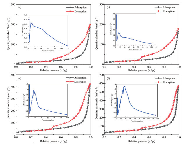 采用X射线衍射仪(XRD,D/MAX2200PC,日本理学株式会社)对样品进行物相分析,以Cu Kα为辐射源(λ=0.154 06 nm),管电压为40 kV,管电流为100 mA,扫描角度范围为5°~80°;利用场发射扫描电子显微镜(SEM,SU8100,日本HITACHI公司)观测样品的微观形貌;利用ASAP2460型比表面分析仪(美国麦克仪器公司)测试样品的BET(Brunauer- Emmett-Teller)比表面积以及孔径分布;采用FEI Tecnai G2 F20 S-TWIN型高分辨透射电子显微镜(TEM,美国FEI公司,工作电压为200 kV)表征样品的微观形貌及晶格结构;借助X射线光电子能谱仪(XPS,Thermo Scientific K-Alpha)对样品进行组成及价态分析,以Al Kα(1 486.6 eV)为激发源,以C1s的电子结合能(284.8 eV)为标准进行误差校正。