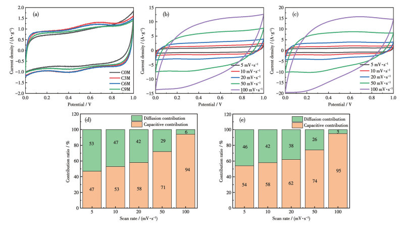 式中,i为CV中某一特定电压时的电流,k1v代表电容控制贡献的电流,k2v1/2代表扩散控制贡献的电流,k1、k2分别为电容控制和扩散控制系数,v为不同的扫描速率。利用式2计算不同扫描速率下电容控制和扩散控制的贡献率,如图 6d和6e所示。在扫描速率为5、10、20、50和100 mV·s-1时,C0M的电容控制贡献率分别为47%、53%、58%、71%和94%,C6M的电容控制贡献率分别为54%、58%、62%、74%和95%,说明C0M和C6M的容量是由电容控制和扩散控制共同贡献,其中电容控制占主导地位。相对于相同扫描速率下C0M的电容贡献率,C6M的电容贡献率更高,因此C6M的电容保持率更高,电极稳定性更好。