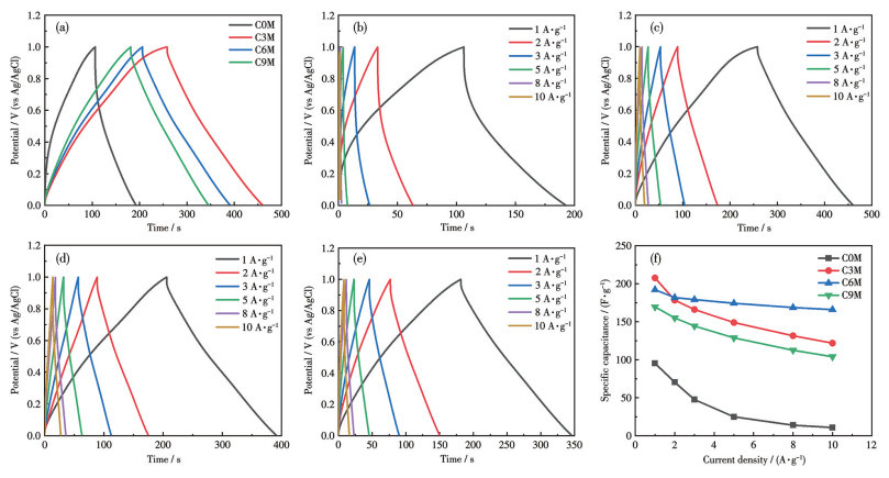 图 7a为不同样品在1 A·g-1的电流密度下的GCD曲线,所有曲线均呈类等腰三角形。相比于C0M,掺杂样品的放电时间延长,内部电压降(iR)减小,其中C3M的放电时间最长,电压降最小。电压降减小意味着样品的反应极化减小,反应可逆性增强。在1 A·g-1的电流密度下,C0M、C3M、C6M和C9M的比电容分别为95.29、207.67、192.55和169.58 F·g-1。图 7b~7e为C0M、C3M、C6M和C9M在1~10 A·g-1的电流密度下的GCD曲线,随着电流密度的增加,样品的充放电时间均缩短,比电容降低,这是因为样品在高电流密度下极化更加严重。图 7f对比了所有样品在不同电流密度下的比电容。当电流密度从1 A·g-1增加至10 A·g-1时,C0M、C3M、C6M和C9M的比电容保持率分别为11.3%、58.9%、86.39%和61.3%。此外,在相同电流密度下,C3M、C6M和C9M的比电容明显高于C0M。
