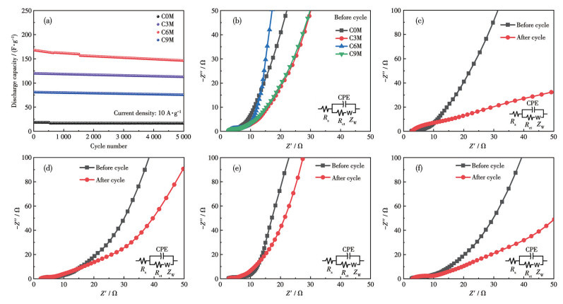 图 8c~8f为C0M、C3M、C6M和C9M在10 A·g-1的电流密度下进行5 000次循环前后的EIS,根据等效电路图进行数据模拟得到的循环前后的Rct如表 3所示。由表可见,掺杂样品循环后的Rct都明显低于C0M。C6M循环5 000次前后的Rct分别为0.003和0.016 Ω,均小于其他样品,意味着该样品的导电性能最佳。电极循环前后的Rct差值(ΔRct)反映材料的稳定性,ΔRct越小稳定性越高。掺杂后样品的ΔRct明显降低,其中C6M的ΔRct最小,进一步说明其具有优异的循环稳定性。